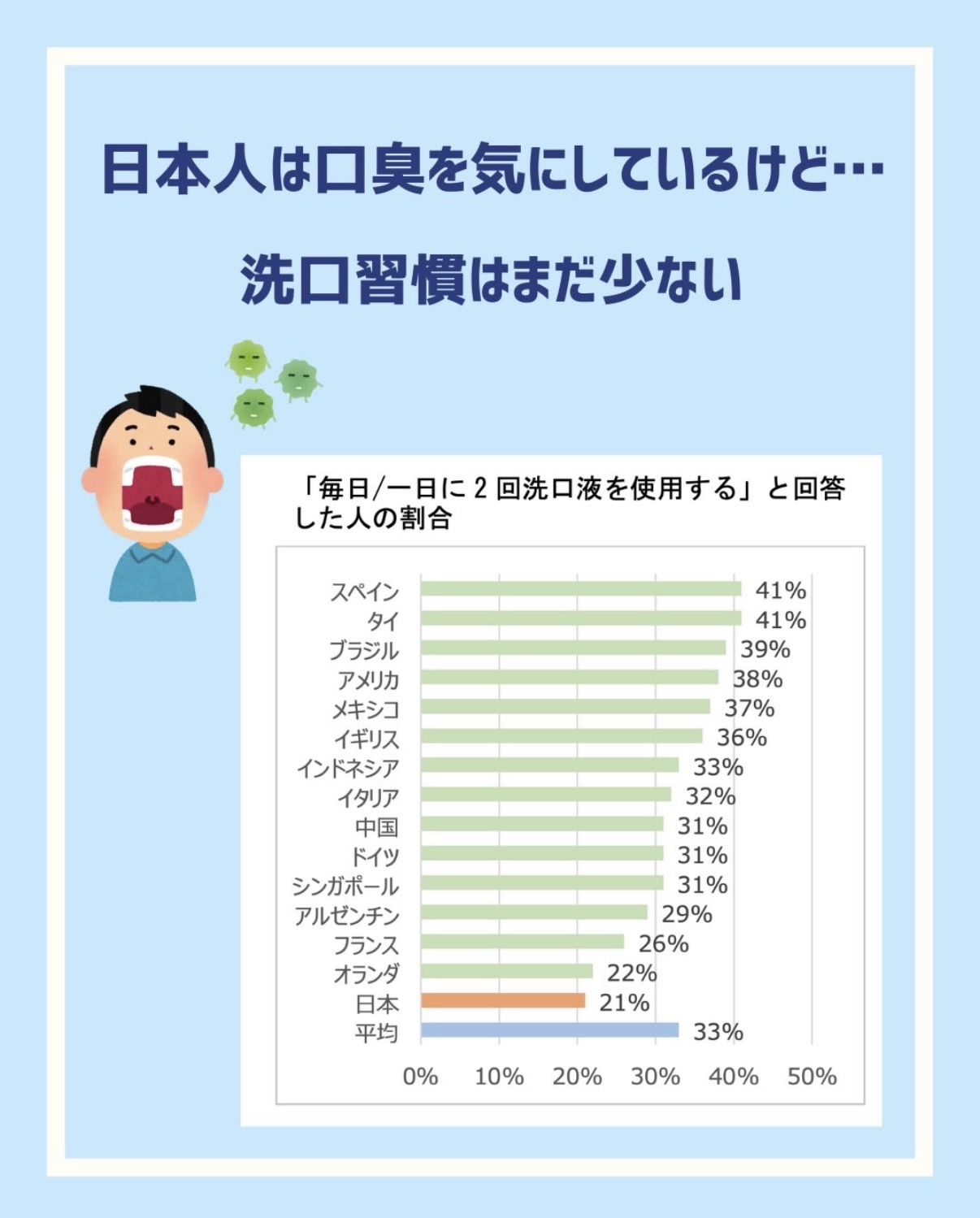 日本人は歯みがきの習慣は比較的よく身についているものの、洗口液を使ってうがいをする習慣は他の国と比べて非常に少ないです…